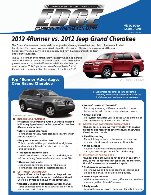 The grand cherokee comes with 295 horsepower and the 4runner has 270. Compare price expertuser reviews mpg engines safety cargo capacity and other specs. The jeep offers several trims covering a wide range of applications but the 4runner is more strictly geared towards off roading.